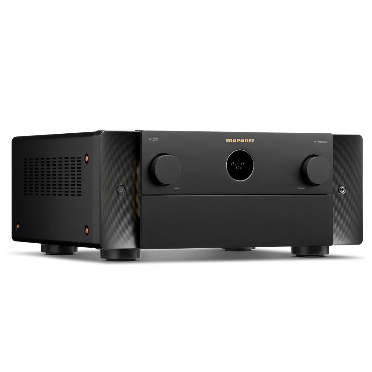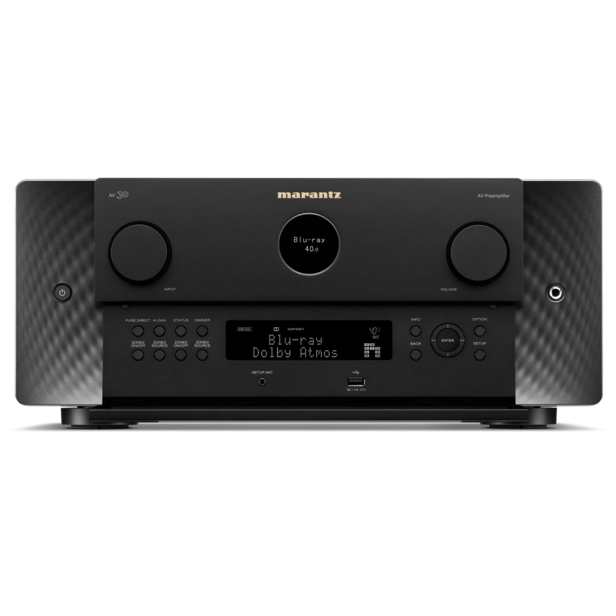 Una expresión moderna de los principios de diseño atemporales, el procesador AV 30 presenta el icónico ojo de buey de Marantz, materiales de primera calidad y luces laterales sutiles que iluminan el panel frontal.