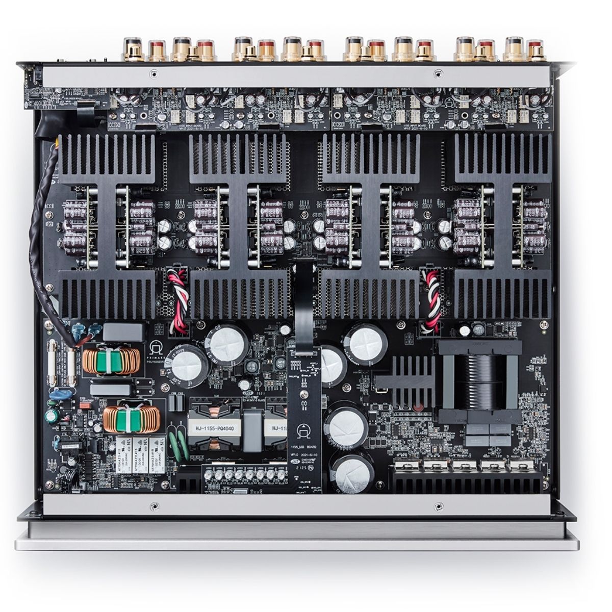 El ingenioso diseño del circuito A35.8 proporciona la entrega más directa y una distribución uniforme de la potencia desde la fuente de alimentación hasta los módulos amplificadores, alojados en disipadores térmicos que los aíslan del ruido de la fuente. A su vez, esta innovadora construcción aísla las etapas de entrada y salida de cualquier ruido que los módulos amplificadores puedan producir. Las señales de entrada y salida se envían hacia y desde el módulo amplificador a través de una cinta continua de circuito impreso, conectada a través de un canal en los disipadores térmicos, para acortar al máximo la ruta de la señal.