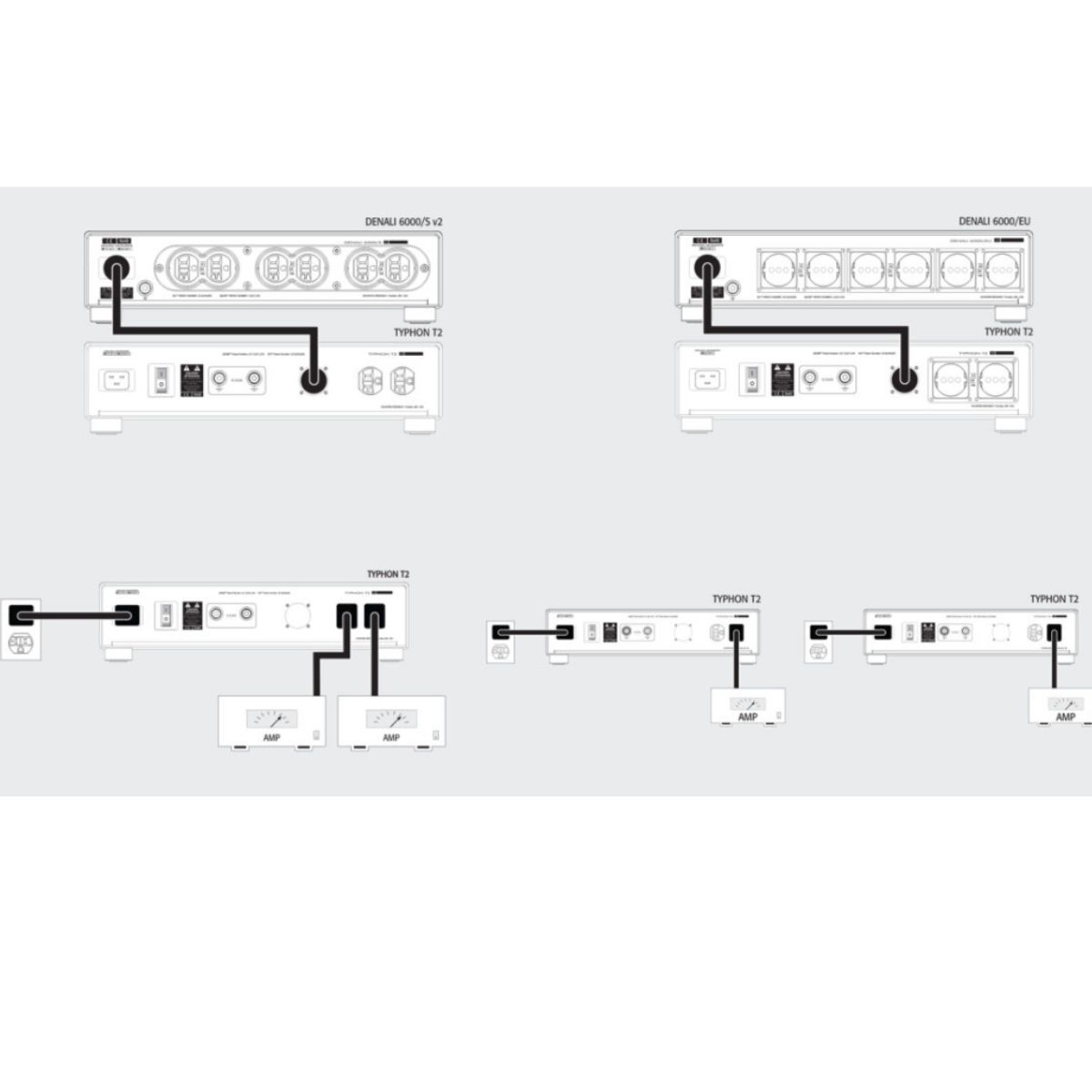 El modelo Typhon T2 puede utilizarse como distribuidor de potencia de referencia independiente para cualquier tipo de amplificador, independientemente de su exigencia, o para otros componentes electrónicos de referencia remotos. El Typhon T2 ocupa el mismo chasis que el Denali 6000S/v2, lo que facilita su apilamiento y conexión desde la pared, y posteriormente a través de su cable umbilical , al distribuidor de potencia. El T2 también puede utilizarse con el Denali 6000s/v1 original o con cualquier distribuidor de potencia de Shunyata Research inferior al Everest 8000. Sea cual sea la aplicación o combinación, el Typhon T2 ofrecerá una mejora de rendimiento impresionante a nivel de componentes para cualquier sistema, independientemente de su tamaño.
