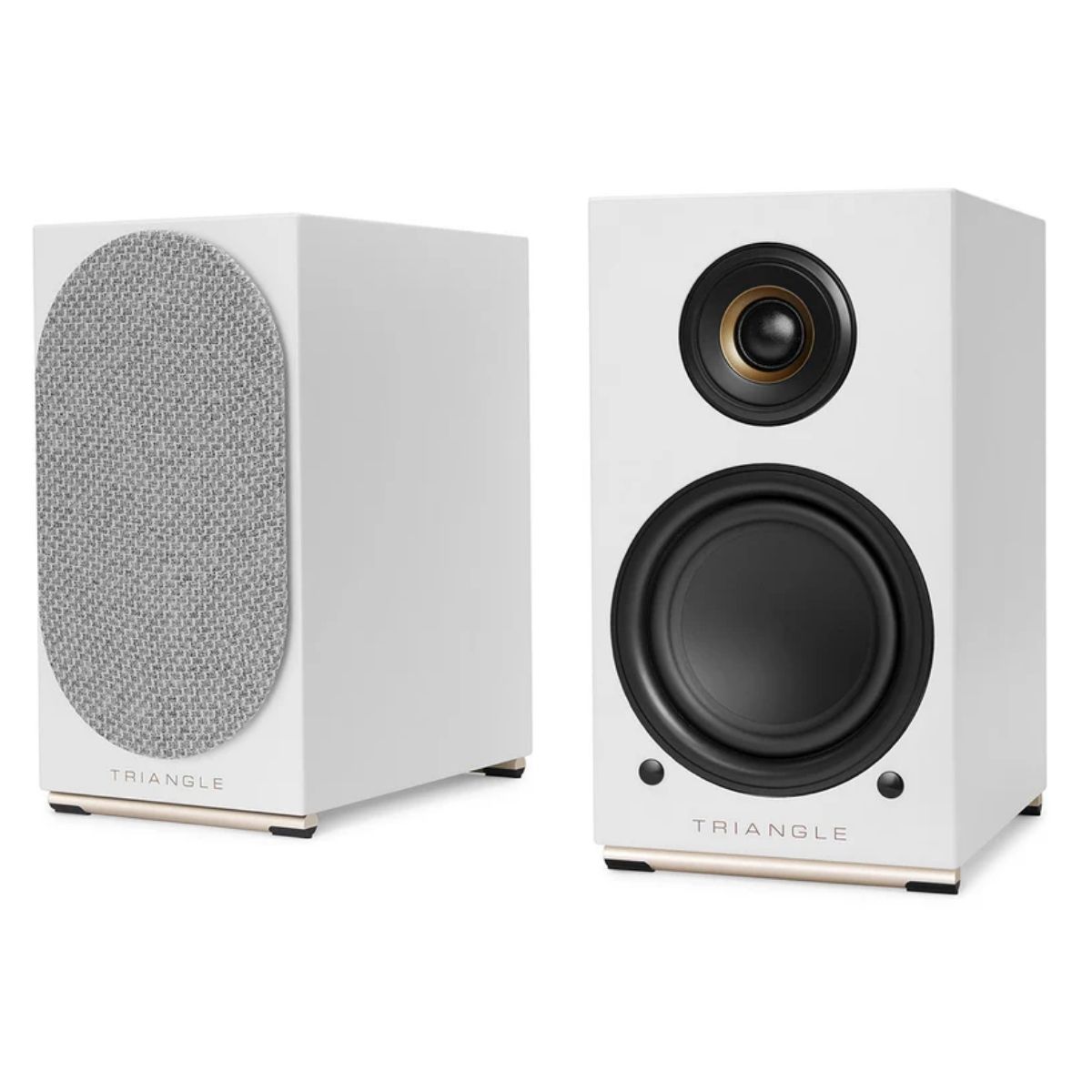 La selección de materiales de los Triangle AIO TWIN no solo cumple estándares estéticos sino también acústicos. Estos altavoces están equipados con elegantes pies de aluminio, dotados con almohadillas de goma para disipar las vibraciones. La ebanistería, en partículas de madera de alta densidad, son de una neutralidad extrema, para lograr la suficiente rigidez y vitar cualquier coloración de la señal sonora.