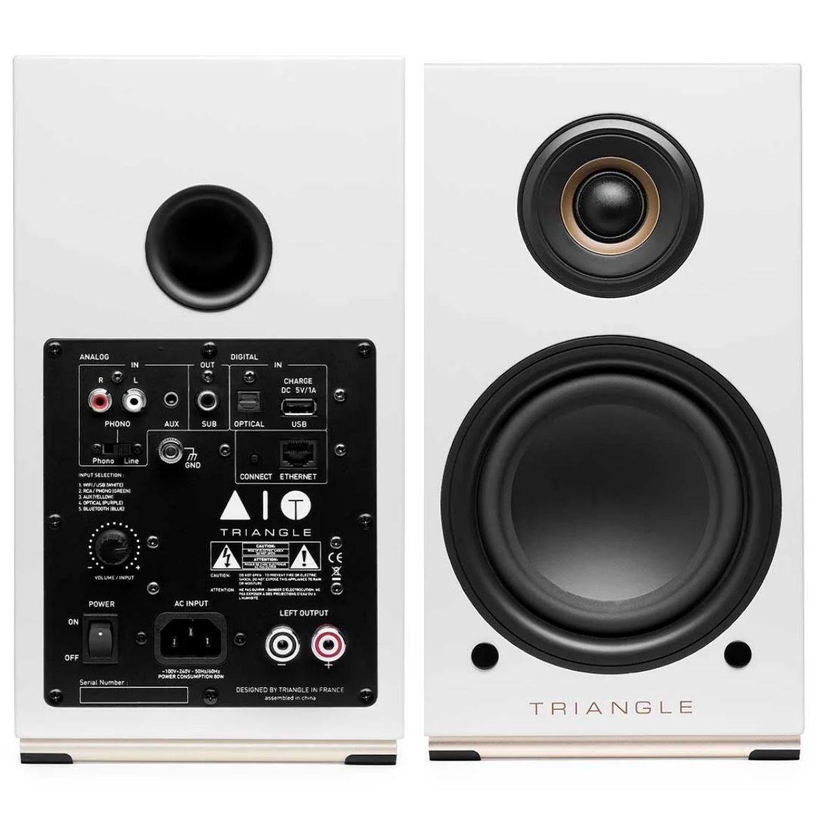 Los altavoces Triangle AIO TWIN son un auténtico sistema todo en uno que abraza la modernidad gracias a su amplio panel de conexiones, en el que no falta conectividad WiFi, Bluetooth y previo de phono para poder utilizar los altavoces con tu tocadiscos.