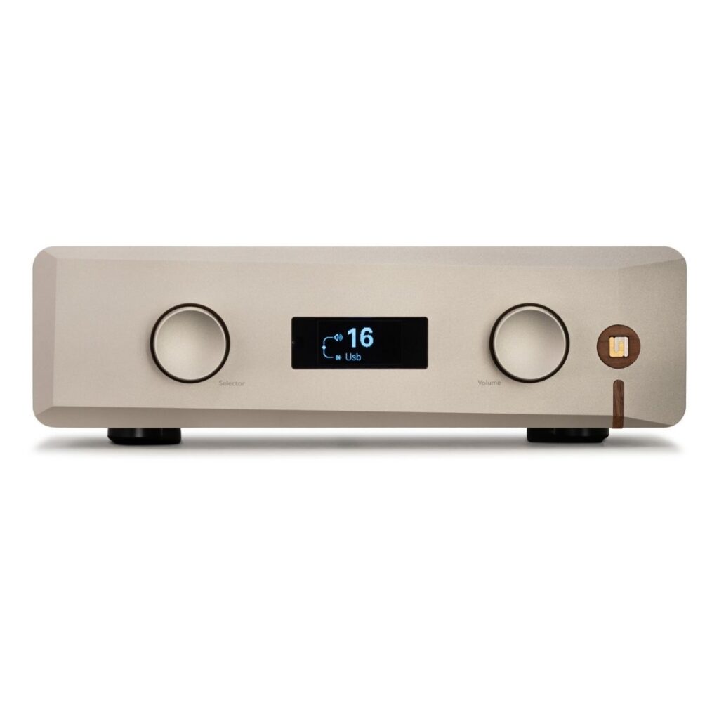 El panel frontal, mecanizado a partir de un bloque sólido de aluminio de 15 mm de grosor, transmite una solidez y precisión de construcción excepcionales. Los acabados Midnight Black y Velvet Gold realzan cada detalle del diseño, mientras que la superficie, meticulosamente refinada, resulta agradable tanto al tacto como a la vista. La cubierta superior de aluminio de 2 mm de grosor envuelve todo el amplificador, reforzando la sensación de robustez y continuidad visual.